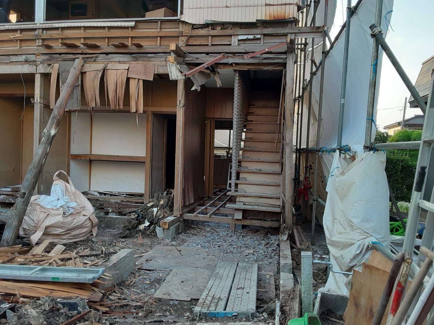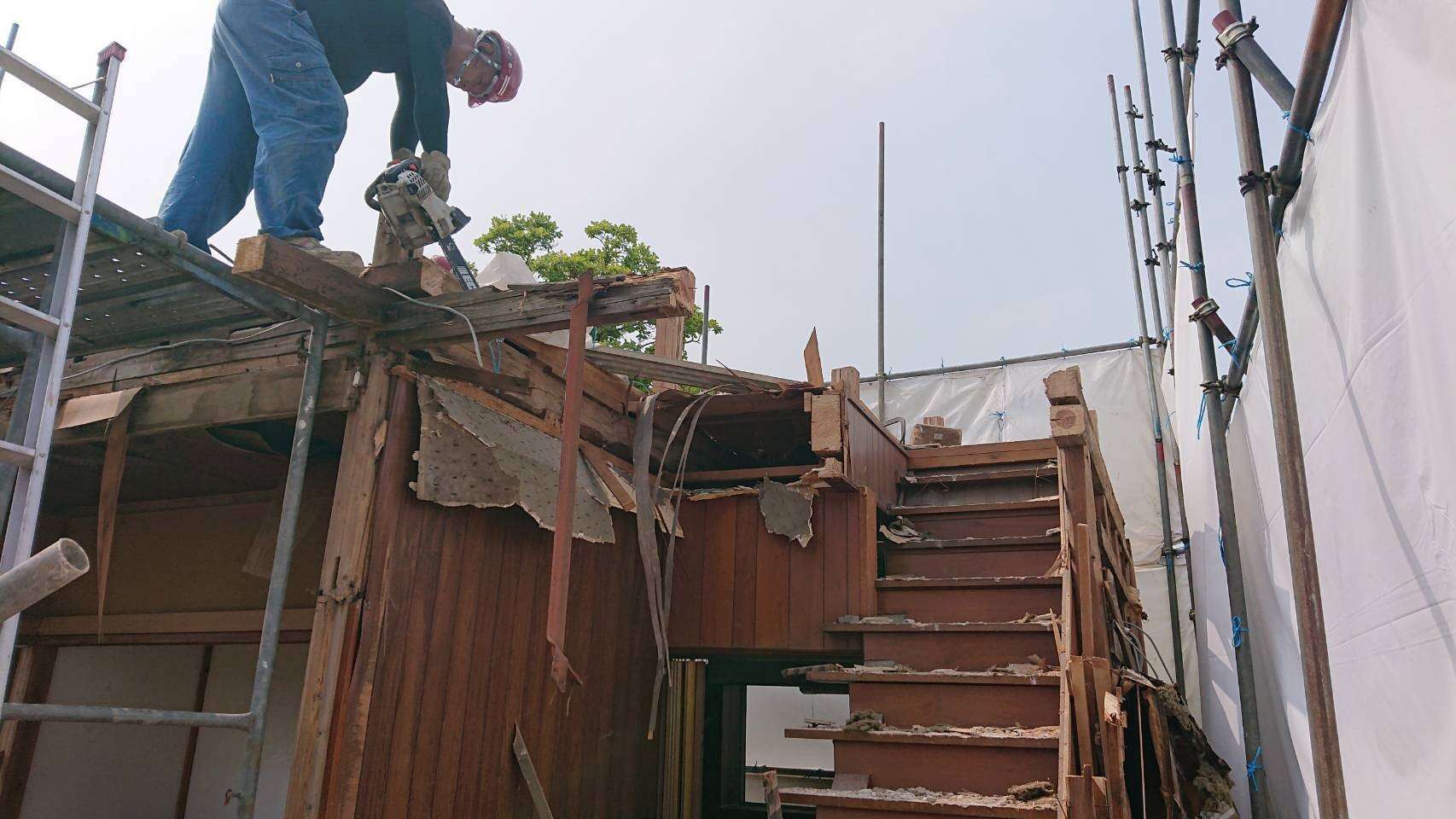 ⑤玄関周りが広くなったら、足場を再度組み直し、2Fから手壊しして行きます。