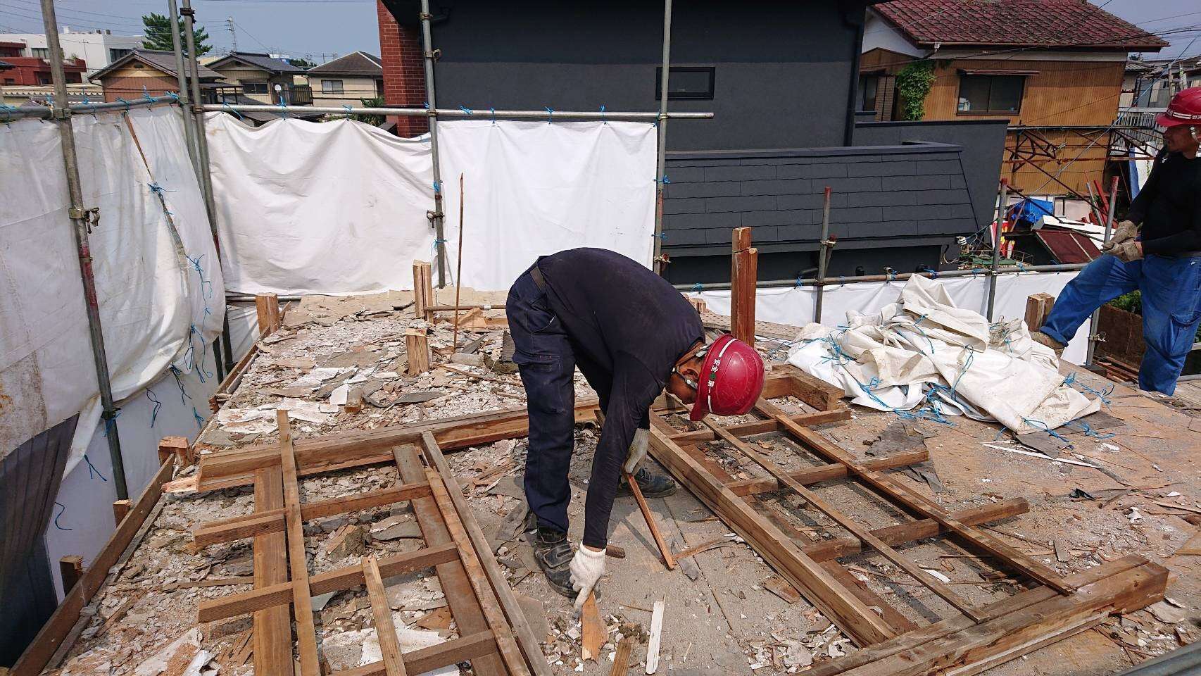 ③足場が組み終わりますと、2Fの瓦下ろしから始めていきます。